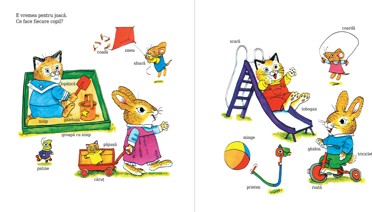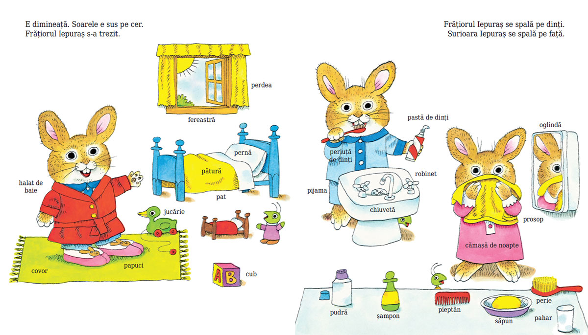 Zi de zi, micule cititor, te afli în mijlocul celei mai mari aventuri: descoperirea lumii în care trăiești. Știi cum se numesc părțile corpului? Dar obiectele din camera ta, din casă sau de la locul de joacă? Și cum e la magazin? Dar la fermă? Câte feluri de vehicule există? Cum e la aeroport? Toate acestea, copiii familiei Iepuraș și prietenii lor le vor învăța împreună cu tine din această carte de cuvinte … al fix!