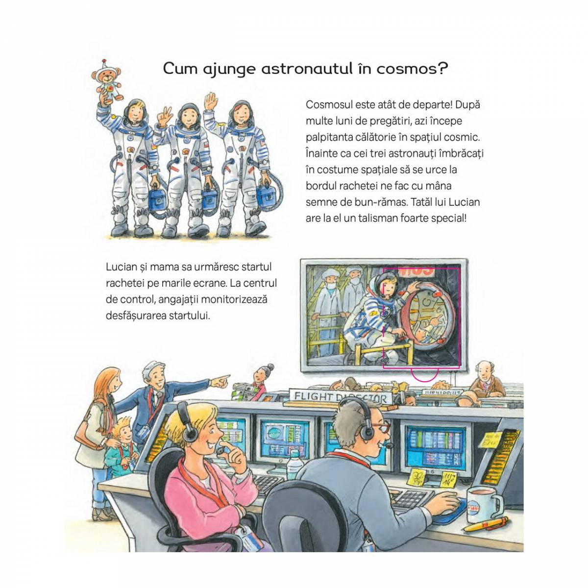 Cum andochează o navă spațială? Cum e viața pe o stație spațială? Ce face un astronaut? Cum arată un costum spatial? – sunt doar câteva din întrebările la care micii cititori vor primi un răspuns în urma lecturării cărții.