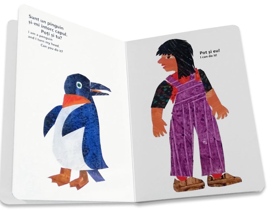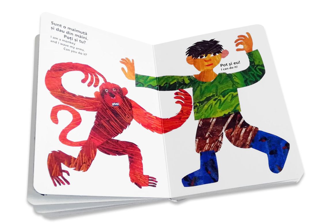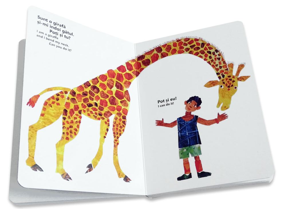 Pornind de la faptul ca tuturor copiilor mici le place sa imite si sa-si miste corpul in moduri neobisuite si amuzante, cartea este un prilej perfect de joaca la gradinita, in parc cu prietenii sau, de ce nu, acasa cu parintii, carora, se stie, le prinde bine intotdeauna putina miscare. Editie bilingva, romana-engleza Secretul succesului lui Eric Carle provine din respectul si intelegerea sa intuitiva fata de copii, care-l simt ca pe cineva care le impartaseste cele mai profunde ganduri si emotii. Cartile sale sunt inspirate in primul rand din natura, pe care o iubeste precum cei mai multi dintre copii. Pe langa ilustratiile spectaculoase si subiectele amuzante, cartile lui Eric Carle ofera copiilor sansa sa invete mereu lucruri noi despre lumea care-i inconjoara. Preocuparea lui Eric Carle pentru binele copiilor, pentru sentimentele si curiozitatea lor, pentru creativitatea si dezvoltarea lor intelectuala face din lectura cartilor sale o experienta mereu stimulanta si atractiva.