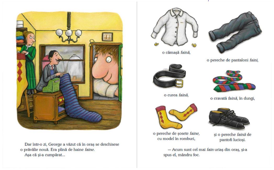 Dar într-o zi, George a văzut că în oraș se deschisese o prăvălie nouă. Era plină de haine faine. Așa că și-a cumpărat…