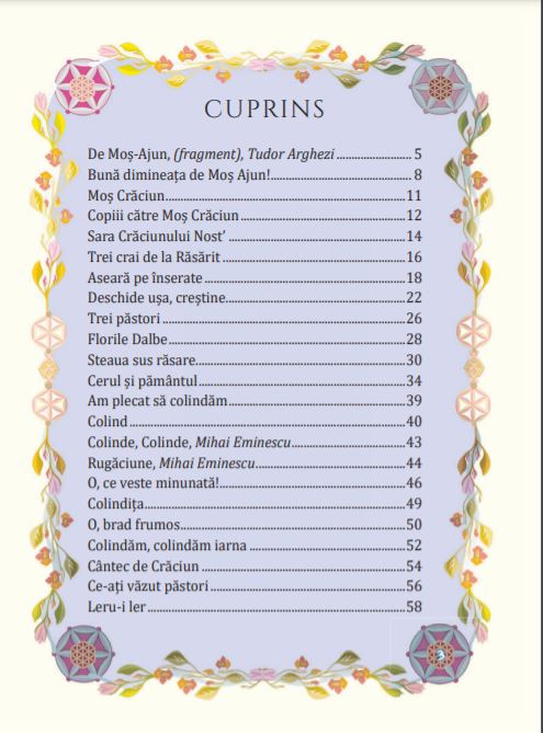 Volumul cuprinde: colinde de copii, colinde de ceată, cântece de stea, vicleimul, steaua, plugusorul, sorcova, vasilca, urăturile, in diverse versiuni locale, variante laice și variante crestine, avându-și, de la caz la caz, origine in folclor, în literatura bizantină Ortodoxă, în literatura latină medievală a Bisericii Catolice, în literatura de sorginte Calvină, dar și în poezia cultă românească, din care am selectat colinde ale unor mari poeți – Mihai Eminescu, George Coșbuc, Octavian Goga